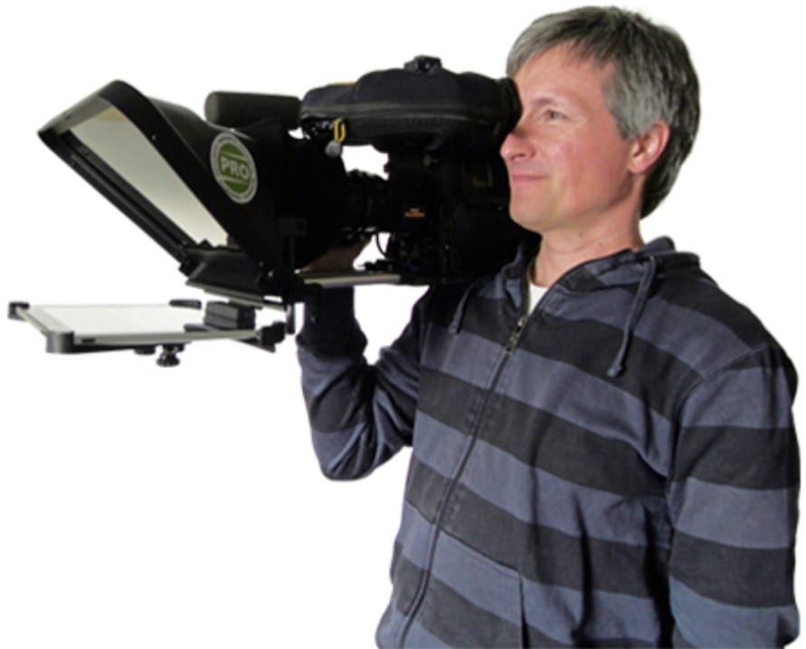 This innovative prompter uses an Apple iPad as its screen. When you think about it, iPads have all the qualities necessary to make an excellent prompter: thin, lightweight, a 10 hour battery and able to accept scripts via E-mail. This unit mounts to professional cameras using standard 15mm rods, just like a matte box. It can also be utilized with smaller cameras using a a hand grip. Need to walk and talk? Need to be on a jib? No problem! The iPad is controlled wirelessly using a second included iPad. It can take lenses with diameters as large as 150mm, and does not vignette with wide angle lenses. Everything you need packs up into a custom watertight case so you can take it on the road. Simple!