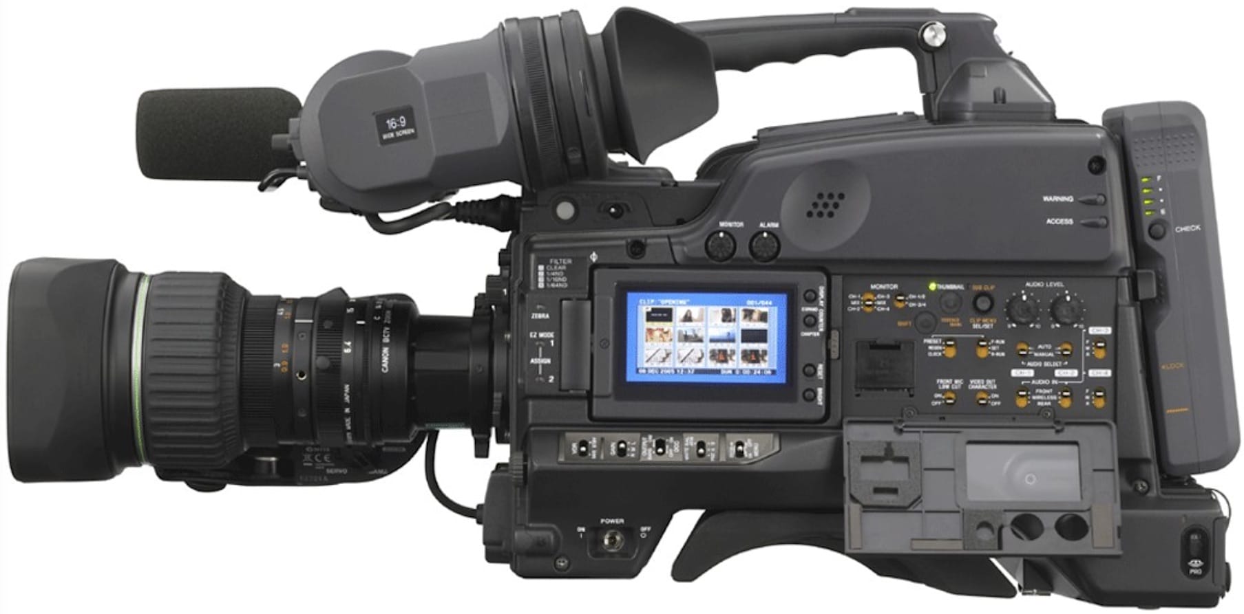 This is the middle ground between the PDW700 and the EX3. It has the same High Definition formats and frame rates as the EX3 (including 24P), but records them on an optical disc, just like the PDW700. A full size shoulder mounted camera, it’s built to withstand the rigors of ENG. It has a high resolution B&W viewfinder, as well as a fold out colour screen. With a dual layer 50 gigabyte disc, it can record an outstanding 150 minutes of High Definition content. It comes with a Fujinon 5.5-94 lens that gets its power from the built-in contacts on the bayonet mount. This camera uses a ½” imager.
