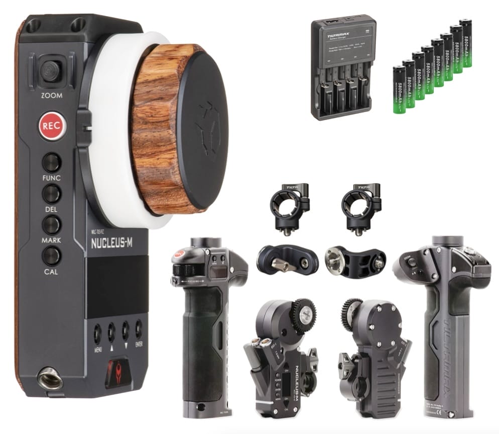 Where this system differs from some others is the inclusion of two additional Zoom and Focus handles. Each of these handles can be mounted to any camera system that has ARRI rosettes, or to any gimbal cage or tripod pan arm that has 25mm or 30mm tubes. These handles allow you to one-man-band a shoot while still retaining manual control of shooting functions. You can support and point the camera with the hand grips while using their integrated thumbwheel and joystick to manipulate Focus and Zoom without ever touching the lens. Cool! We recently upgraded the eight 18650 batteries that come with the package with higher amperage cells for longer run times.